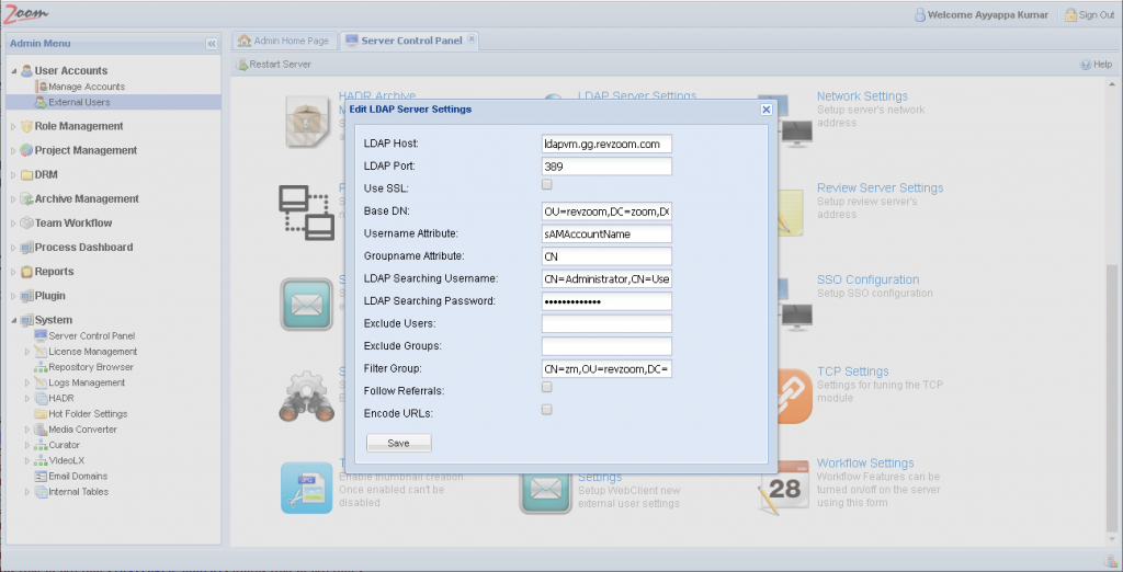 - After the restart, again login to the Web Management Console with the default super admin. Open Server Control Panel page from under the System node in the Admin sidebar menu.